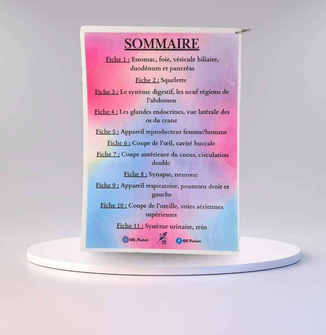 Kit de révisions anatomiques A4 recto-verso plastifié, relié par un anneau et un crochet.